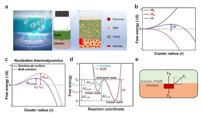 圖1. MAPbBr3鈣鈦礦結晶與晶體生長。(a) PDMS輔助結晶原理圖;(b) 形核半徑與自由能的關系;(c) 溶液的表面和內(nèi)部的形核半徑的比較;(d)生長過程中自由能變化圖解;(e)界面懸浮生長的力學圖解。