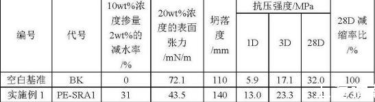 按上面步驟制備的減水劑進行配比,采用基準水泥或者代用的工程普通水泥,砂率39wt%,配合比(質(zhì)量比)為水泥:砂子:碎石=330:720:1100,PE±SRA減水劑10wt%濃度摻量2wt%,通過調(diào)整用水量控制混凝土坍落度在90-145mm,檢測后得知,PE-SRA系列與PE+SRA系列的表面張力相近,但相同摻量條件下PE-SRA系列的減水率和減縮效果遠遠好于PE+SRA系列。