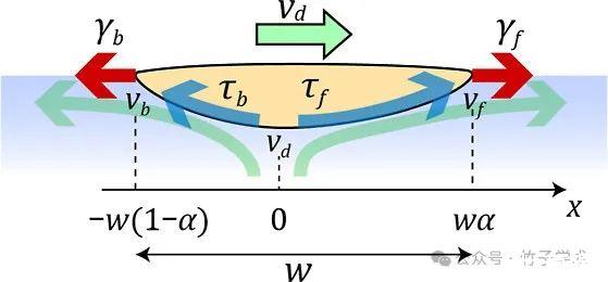 圖6是描述BS液滴自推進的簡化模型。紅色箭頭所示的γf和γb分別代表液滴前部和后部界面張力所產(chǎn)生的力的大小。用藍色箭頭繪制的τf和τb分別代表來自向前和向后界面流的粘性力。綠色箭頭表示液滴下方的流動,vb、vd和vf表示液滴下方每個x位置處的流速。假設(shè)τb和vb具有負(fù)值,因為它們處于液滴運動的相反方向。
