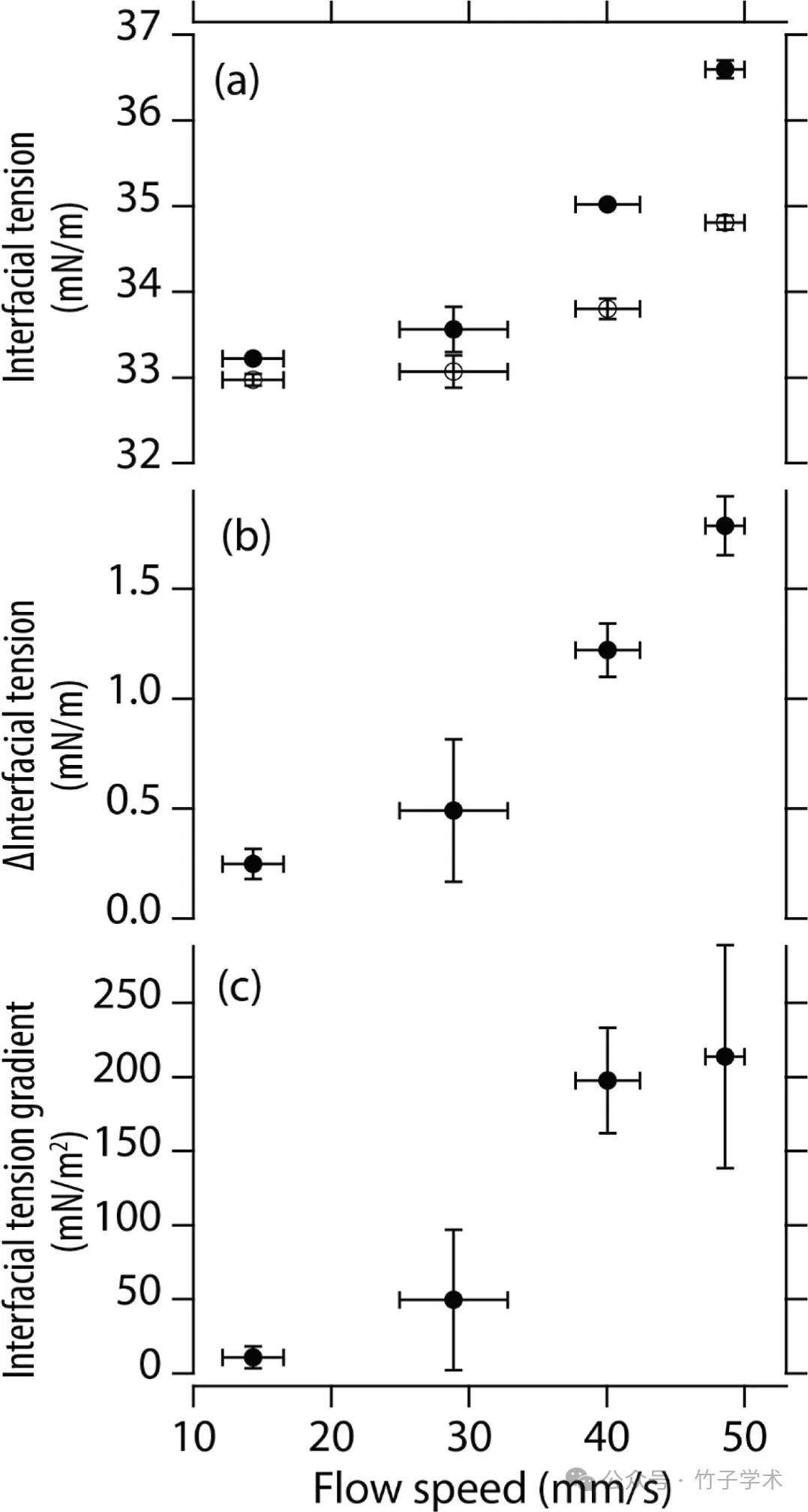 圖8是(a)液滴前面的系統(tǒng)界面張力的最大值(實心圓)和液滴前面的外推界面張力(空心圓)作為前端流速的函數(shù)。(b)上述最大值和前沿值之間的界面張力差與前沿流速的關(guān)系。(c)前沿流速與前沿界面張力梯度之間的關(guān)系。