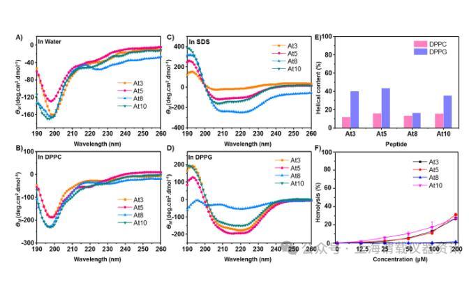 圖2、設(shè)計肽的二級結(jié)構(gòu)和溶血特性。(A)水、(B)25 mM SDS、(C)兩性離子DPPC SUV(0.25 mg mL-1)和(D)帶負電荷的DPPG SUV(0.25 mg mL-1)中肽的CD光譜。所有四種肽(At3、At5、At8、At10)在水和DPPC SUV中均呈現(xiàn)無規(guī)卷曲結(jié)構(gòu),而在SDS和DPPG SUV中均采用螺旋結(jié)構(gòu)。肽濃度固定在0.1 mM。所有測量均在室溫下進行。(E)DPPC和DPPG SUV中肽的α-螺旋含量。(F)肽的溶血活性。用不同濃度的肽處理人紅細胞(hRBC)并在37°C下孵育1小時。然后在OD540nm處測量吸光度。