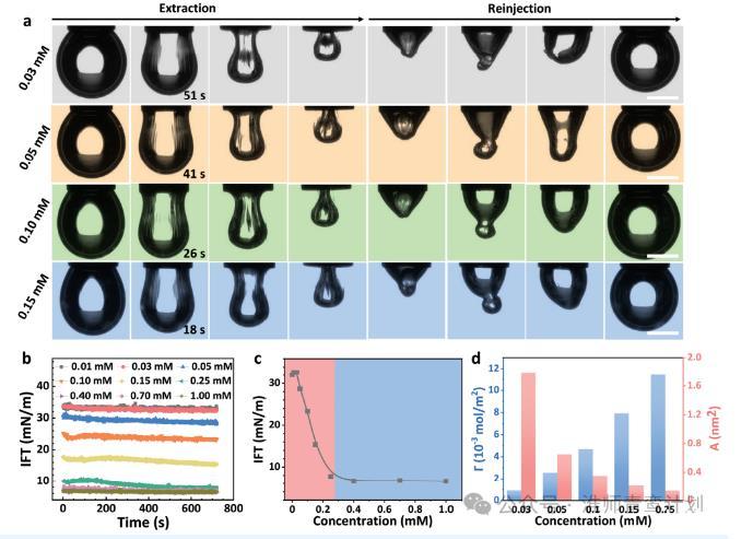 首先,在GL和SSD共組裝之前,用垂滴張力法研究了GL在水-甲苯中的界面行為。如圖1a所示,當提取濃度為0.03、0.05、0.10和0.15 mM的甲苯中GL水溶液的液滴時,分別在51、41、26和18 s時,液滴界面面積減小,在液滴界面上出現(xiàn)了明顯的起皺。同樣,當液滴完全虹吸到針管中并重新注入到初始體積時,起皺現(xiàn)象重新出現(xiàn),液滴由不規(guī)則逐漸擴大到規(guī)則。抽注過程中起皺現(xiàn)象的出現(xiàn),有力地揭示了水-甲苯界面處彈性膜的形成。圖1b測量了GL溶液和甲苯之間的時間分辨界面張力(IFT)。當GL濃度<0.03 mM時,甲苯與GL溶液之間的界面張力近似等于純水與甲苯之間的界面張力(≈32 mN·m?1)。隨著GL溶液濃度從0.03增加到0.25 mN·m?1,界面張力下降到6.8 mN·m?1,而從0.25到1.00 mM,界面張力保持在6.8 mN·m?1不變當GL濃度<0.03 mM時,甲苯與GL溶液之間的界面張力近似等于純水與甲苯之間的界面張力(≈32 mN·m?1)。隨著GL溶液濃度從0.03增加到0.25 mM,界面張力下降到6.8 mN·m?1,而從0.25到1.00 mM,界面張力保持在6.8 mN·m?1不變。據(jù)此,確定0.25 mM為GL分子在水-甲苯界面處的臨界膠束濃度(CMC)(圖1c)。這意味著液滴在GL的CMC以下會發(fā)生收縮,而在CMC以上液滴會發(fā)生起皺。為了進一步解釋這一現(xiàn)象,我們計算了不同濃度下GL分子的界面吸附容量和截面積。圖1d我們可以看到GL的界面吸附量隨濃度的增加成比例增加,相反,隨著濃度的增加,橫截面積減小。綜上所述,GL是一種特殊的兩親分子,可以在油水界面形成界面膜。