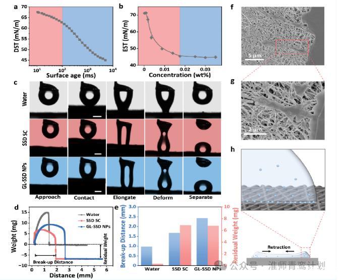 然后,作者研究了GL-SSD NPs液滴在疏水表面的沉積機理。先是測量了GL-SSD NPs溶液的動態(tài)表面張力(DST)和粘度。DST結(jié)果顯示,GL-SSD NPs溶液在前100 ms內(nèi)發(fā)生輕微變化,這意味著GL-SSD NPs的擴散速率較慢,EST值隨著濃度從0到0.018 wt%的增加而減小到45 mN m?1,而當濃度高于0.018 wt%時,EST值保持不變。因此,0.018 wt%作為GL-SSD NPs的臨界膠束濃度(CMC)清楚地觀察到接近、接觸、伸長、變形和分離的順序過程。從PTFE表面分離后,水滴從表面被徹底清除,沒有留下任何殘留物,而SSD SC和GL-SSD NPs液滴在中間發(fā)生了明顯的伸長和斷裂,在表面保留了大量的液體。水、SSD SC和GL-SSD NPs的殘余質(zhì)量分別為0.35、6.9和6.8 mg,而GL-SSD NPs溶液的破裂距離為2.43 mm,遠高于水和SSD SC的0.97 mm和1.68 mm,表明GLSSD NPs與PTFE表面的相互作用最強。此外,掃描電鏡(SEM)圖像顯示,撞擊后的縮回軌跡中留下了大量的液滴殘留物。在液滴撞擊過程中,大量GL-SSD NPs在三線處的沉積會利用PTFE表面固有的親水性改變其潤濕性,產(chǎn)生固定點,延緩液滴縮回。