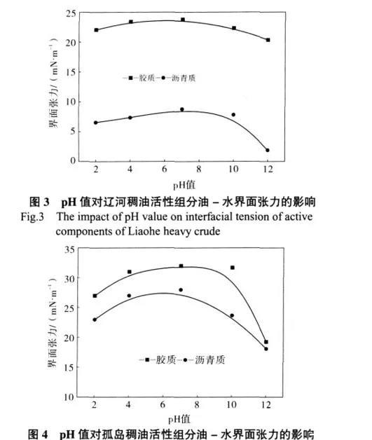 遼河稠油活性組分的氧、氮含量高,酸性基團(tuán)多,但芳香共扼結(jié)構(gòu)多,空間阻滯作用強(qiáng),酸性基團(tuán)參與反應(yīng)的機(jī)率相對(duì)要低。反之,孤島稠油活性組分酸性基團(tuán)少,但芳香共扼結(jié)構(gòu)也少,酸性基團(tuán)參與反應(yīng)的機(jī)率相對(duì)要高。組分表現(xiàn)出來的界面活性差別是這兩種因素相互競(jìng)爭(zhēng)的結(jié)果,因此,pH值對(duì)遼河稠油活性組分的油-水界面張力的影響總體上略大于對(duì)孤島稠油活性組分的影響。