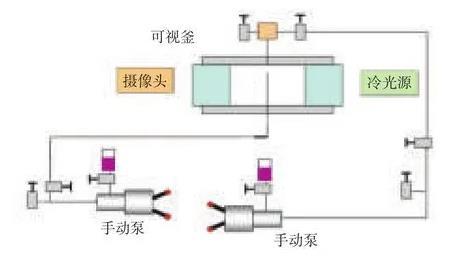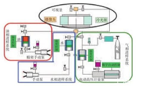 潤濕性及界面張力儀主要包括常溫常壓型、高溫型、超高溫型、便攜型,其中高溫高壓型潤濕性及界面張力儀能夠真實模擬油藏條件測量接觸角和界面張力。為了擴展高溫高壓潤濕性及界面張力儀可以測量二氧化碳與原油最小混相壓力功能,且可以使常溫凝固的稠油等樣品,實現(xiàn)順利進樣測量和測量,需要對現(xiàn)有設(shè)備進行改造。通過增加高溫高壓氣體進樣系統(tǒng),改進原有油相、水相進樣系統(tǒng),使其功能得到擴展。