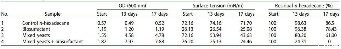 用酵母和生物表面活性劑修飾的樣品 4 表現(xiàn)出最高的 OD 增加,即與起始值相比增加了 4.4 倍,表明酵母在生物表面活性劑存在下生長得更快(表 4)。 正十六烷的降解率從用酵母修正時的 12 毫克/天增加到酵母和生物表面活性劑同時存在時的 30 毫克/天。 在生物表面活性劑存在下 17 天后,正十六烷耗盡。