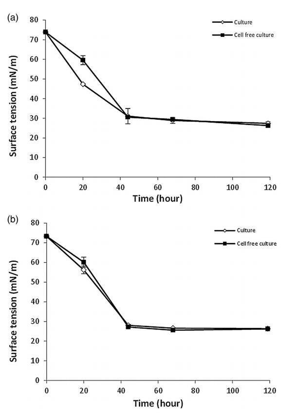 為了確定生物表面活性劑的合成是否與石油烴上的細菌生長有關,在磷酸鹽緩沖液和煤油中對兩種菌株 LF-13 和 LF-22 進行了靜息細胞實驗。 紅球菌屬的細胞懸液和無細胞培養(yǎng)濾液的表面張力。 LF-13 和紅球菌屬。 LF-22 靜息細胞在培養(yǎng) 2 天后顯示出顯著減少,從 72 到 26 mN m-1(圖 2)。 結果表明,紅球菌菌株中的生物表面活性劑合成發(fā)生在煤油存在下,但不一定與煤油上的細菌生長有關。