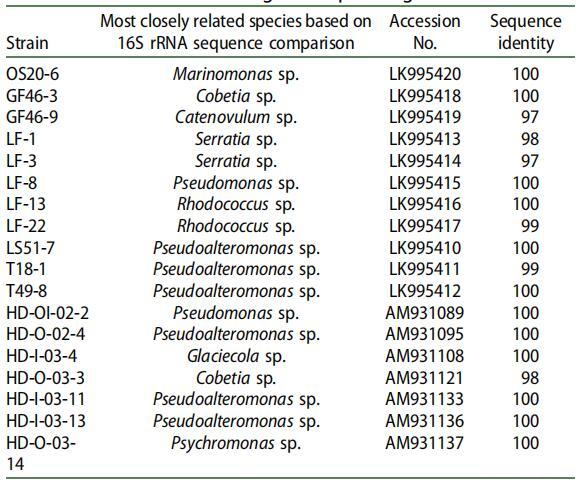 通過 16S rRNA 基因序列分析對具有顯著 SAC 活性的 18 個分離株進行分類鑒定(表 2)。 紅球菌除外。 菌株 LF-13 和紅球菌屬。 在菌株 LF-22 中,大多數(shù)鑒定的 SAC 生產者是革蘭氏陰性菌,屬于 γ-變形菌綱。 也有報道稱 γ-變形菌在寒冷海洋地區(qū)的石油污染地點占優(yōu)勢。 [21-24] 先前對石油污染地點的研究表明,假單胞菌、假交替單胞菌、冰川、海藻和紅球菌是極地、海洋區(qū)域。[21,22,25-28]