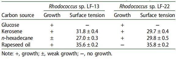 兩種細菌菌株紅球菌屬。 菌株 LF-13 和紅球菌屬。 當以煤油作為唯一碳源和能源時,菌株 LF-22 能夠將培養(yǎng)基的表面張力降低約 40 mN m-1。 因此,它們被選擇用于進一步表征生物表面活性劑的生產。 為了拓寬生物表面活性劑生產的底物范圍,測試了除煤油和葡萄糖之外的其他碳源(表 3)。 這兩種菌株可以在葡萄糖上生長,但不合成生物表面活性劑。 他們能夠在正十六烷和菜籽油上產生 SAC,即使菜籽油不支持菌株 LF-22 的生長。