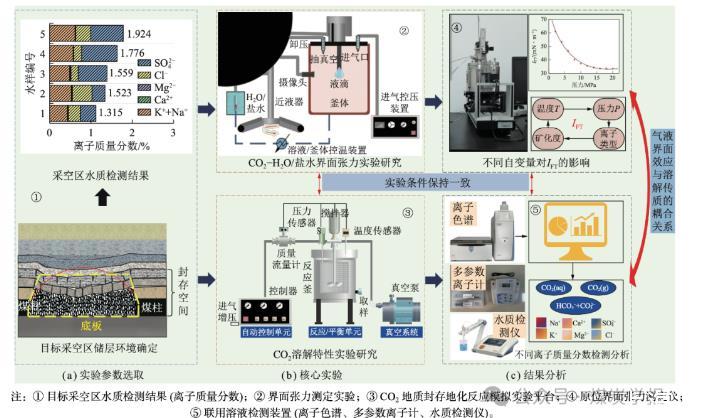 采空區(qū)CO2封存作為解決煤炭行業(yè)碳排放難題的重要負(fù)碳技術(shù)儲(chǔ)備,在采空區(qū)廢棄資源二次利用、CO2封存等方面具有廣泛的應(yīng)用前景。利用原位界面張力測(cè)定儀開(kāi)展了不同溫壓、地層水礦化度及陽(yáng)離子溶液類(lèi)型對(duì)CO2地層水系統(tǒng)的界面張力(IFT)影響規(guī)律實(shí)驗(yàn),明晰了CO2注入含水碎脹煤巖體中的氣液界面擴(kuò)散效應(yīng),并將基于統(tǒng)計(jì)締合理論結(jié)合蘭納?瓊斯勢(shì)能模型的狀態(tài)方程(SAFT-LJ狀態(tài)方程)與密度梯度理論(DGT)結(jié)合預(yù)測(cè)了IFT理論值;利用自主研發(fā)的地質(zhì)封存地化反應(yīng)模擬實(shí)驗(yàn)平臺(tái)對(duì)相同條件下的CO2溶解性進(jìn)行了探究實(shí)驗(yàn),得到了采空區(qū)儲(chǔ)層環(huán)境下CO2溶解度變化特征,采用D-S模型計(jì)算了對(duì)應(yīng)CO2溶解度理論值。