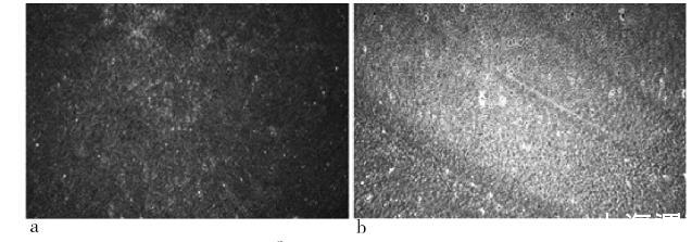 利用BAM研究了DEAE-瓊脂糖單分子膜的成膜過(guò)程,圖4為表面壓為0 mN/m和34 mN/m的BAM圖像結(jié)果。通過(guò)對(duì)BAM圖像的觀測(cè),可以看出其成膜過(guò)程,確定其是否成膜。圖4-a為DEAE-瓊脂糖剛滴加在亞相上的BAM圖像,分子被平鋪在亞相表面,相對(duì)分散,呈氣相狀態(tài),此時(shí)布魯斯特角的折射不受表面分子影像,圖像顏色較深,看不出分子的具體形態(tài)。待其揮發(fā)一定時(shí)間后,隨著滑障的持續(xù)壓縮,DEAE-瓊脂糖由分散狀態(tài)到聚集成膜,最后在亞相上形成相對(duì)穩(wěn)定的固相區(qū)域。圖4-b為固相狀態(tài)下的DEAE-瓊脂糖單分子膜,可以看出此時(shí)分子之間排列緊密,分子間距較小,已經(jīng)形成固相狀態(tài)。由于分子在亞相表面緊密排列形成了單分子層,改變了布魯斯特角的折射,使得圖像的顏色變淺。通過(guò)對(duì)表面壓為0 mN/m和34 mN/m的BAM圖像對(duì)比可以看出,DEAE-瓊脂糖分子由一開(kāi)始的分散狀態(tài)到達(dá)最后穩(wěn)定的固相狀態(tài),成功形成了穩(wěn)定的便于提拉的單分子層。