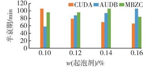 泡沫性能直接關系到起泡劑在地層的封堵效果。目前,油田驅油用表面活性劑工業(yè)品主要有陰離子型、非離子型和兩性型單獨或復配使用,其泡沫性能差別很大。起泡劑的濃度是影響起泡劑活性的重要因素之一,合理的濃度設置必須使其既具有高效的泡沫特性也具有一定的經濟性,故選擇CUDA、AUDB、MBZC這3種非離子-陰離子型起泡劑,在其質量分數分別為0.10%、0.12%、0.14%和0.16%時,評價這3種起泡劑發(fā)泡量、半衰期、泡沫綜合指數等性能。