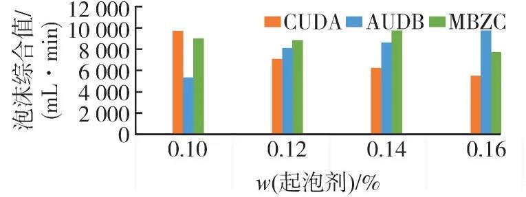 由圖2可知:隨著起泡劑用量的增加,CUDA型起泡劑的泡沫綜合指數逐漸下降;AUDB型起泡劑的泡沫綜合指數逐漸升高,且在質量分數達到0.16%時達到峰值9 762 mL·min;而MBZC型起泡劑的泡沫綜合指數先上升后下降。由此可見,AUDB型起泡劑的泡沫強度最高。