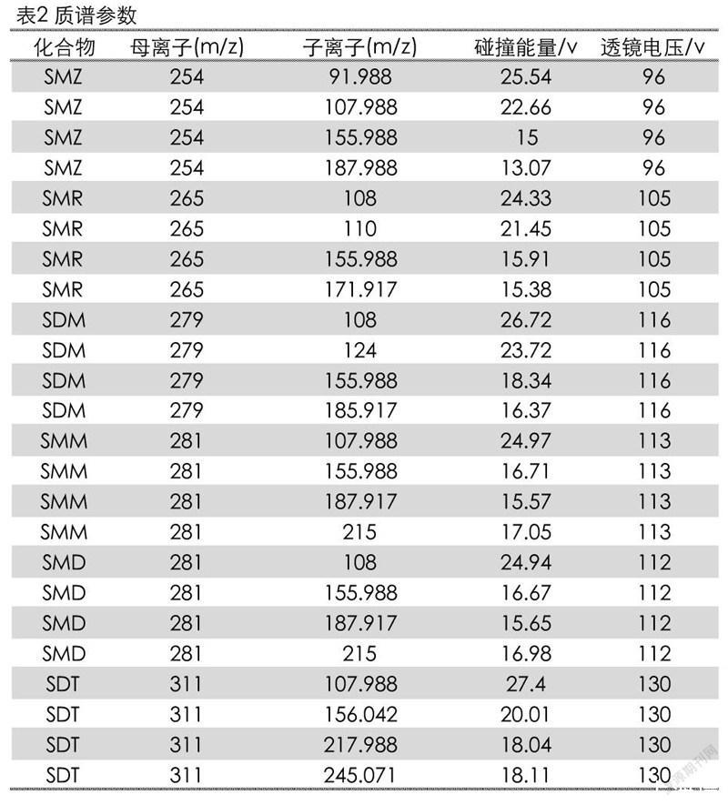 6種磺胺類標(biāo)準(zhǔn)物質(zhì):磺胺甲惡唑(SMZ)、磺胺甲基嘧啶(SMR)、磺胺間二甲氧嘧啶(SDM)、磺胺間甲氧嘧啶(SMM)、磺胺對(duì)甲氧嘧啶(SMD)、磺胺地索辛(SDT)(純度均大于99.5%,北京振翔科技有限公司);乙腈(色譜純,德國(guó)Merck公司);甲酸(色譜純,上海安普實(shí)驗(yàn)科技有限公司)。