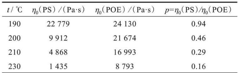 表1不同溫度下POE和PS的零剪切黏度和黏度比