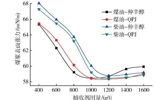 使用QPJ做起泡劑時(shí),煤漿表面張力在煤油用量為1000 g/t時(shí)達(dá)到最低值,在煤油用量超過(guò)1400 g/t后開(kāi)始明顯回升;煤漿表面張力在柴油用量達(dá)到1200 g/t時(shí)達(dá)到最低值,在超過(guò)1400 g/t后開(kāi)始回升。由此可見(jiàn),捕收劑對(duì)煤漿的表面張力有著較為顯著的影響。