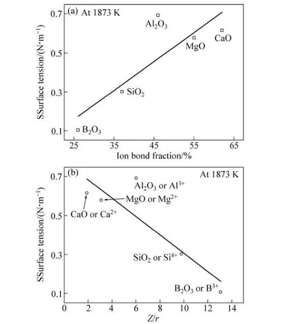 純氧化物表面張力主要與離子間的鍵能有關,形成氧化物的離子的靜電勢(Z/r)大,且離子鍵分數(shù)高的氧化物有較大的表面張力。純組分氧化物的靜電勢和離子鍵分數(shù)如圖3所示。純液態(tài)B2O3屬于表面活性物質(zhì),在1873 K時的表面張力約為0.104 N/m,僅為MgO、CaO、Al2O3和SiO2同溫度純物質(zhì)表面張力數(shù)據(jù)的1/6~1/3。Si4+和B3+離子雖然靜電勢很高,但其離子鍵分數(shù)較低(<50%),易形成共價鍵高、靜電勢小的絡離子,從而其表面張力值較?。籑g2+、Ca2+和Al3+離子雖然靜電勢較小,但離子鍵分數(shù)較高,從而具有較高的表面張力值。