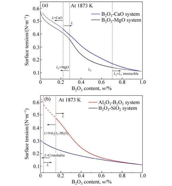 2)含B2O3二元體系中,熔渣表面張力隨B2O3含量的增加而降低,作為表面活性物質(zhì),B2O3組元能顯著降低熔渣表面張力。純氧化物表面張力值與形成氧化物的陽離子靜電勢及氧化物中離子鍵分數(shù)有關。