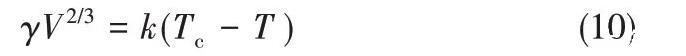 式中,γ是樣品在溫度T下測得的表面張力;V是液體的摩爾體積;Tc是臨界溫度;k是經(jīng)驗常數(shù)。將實驗值γ和V2/3的乘積相對于熱力學(xué)溫度T進行線性回歸,并獲得一條直線,從直線和截距的斜率,可以得到k和Tc的值。對于大部分有機液體來說,k大約為2.1×10-7J·K-1,而對于簡單熔鹽,k比較小,NaCl的k≈10-7J·K-1。