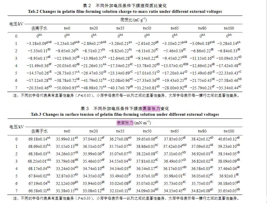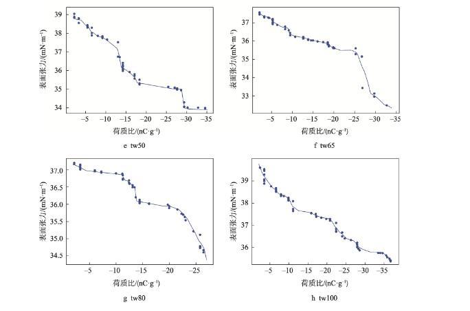 隨著膜液中吐溫20的減少和司盤20的增多,明膠液滴荷質(zhì)比亦呈增高趨勢(shì)(<0.05)。張建桃等[13]研究表明,介質(zhì)的電導(dǎo)率改變會(huì)引起其荷電性能的改變。相同質(zhì)量濃度下司盤20的物質(zhì)的量濃度更高,導(dǎo)致溶液電導(dǎo)率及液滴荷質(zhì)比增加更為明顯。然而,與只添加吐溫20的明膠溶液(tw100)相比,少量司盤20的添加(tw80)還會(huì)引起荷質(zhì)比的顯著減少(<0.05),推測(cè)這是由于溶液中吐溫20與司盤20分子通過“經(jīng)典疏水作用”在水溶液中優(yōu)先結(jié)合,從而使溶液中總?cè)苜|(zhì)相對(duì)濃度下降導(dǎo)致[14]。