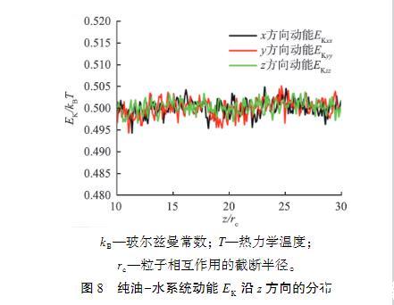 在界面張力的模擬計算公式(5)中,界面張力來源于界面附近處法向壓力和切向壓力的差值,pxx、pyy和pzz是壓力張量p的3個對角分量,壓力張量p又可以進(jìn)一步分解為與原子速度和力有關(guān)的項,即p=(2EK+EV)/V,其中EK為與原子速度有關(guān)的動能項,V為系統(tǒng)的體積,EV為與原子間相互作用力有關(guān)的維里項,EV=∑Ng=1Fg?rg,其中Fg為系統(tǒng)中作用于原子g的力,rg為原子g的位置,N為系統(tǒng)中的原子總個數(shù),?表示張量積。由于Δp=pzz-0.5(pxx+pyy),也可以寫成Δp(2ΔEK+ΔEV)/V,其中動能的變化量ΔEK可以定義為,其中Δp為壓力的變化量,ΔEV為維里項的變化量,EKzz為z方向的動能項,EKxx為x方向的動能項,EKyy為y方向的動能項。為了觀察動能項對界面張力的貢獻(xiàn),本文中計算了純油-水系統(tǒng)的動能沿z方向的分布,結(jié)果如圖8所示。從圖中可以看出,純油-水系統(tǒng)的動能在界面附近基本不變,即動能的貢獻(xiàn)很小,與文獻(xiàn)中的研究結(jié)果一致,因此壓力張量p中與原子相互作用有關(guān)的維里項在界面張力中起主要作用。因為壓力張量中的動能項對壓力影響很小。