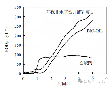 圖1 BIO-OIL、乙酸鈉溶液、環(huán)保非水基鉆井液乳液BOD5隨測(cè)試時(shí)間的變化