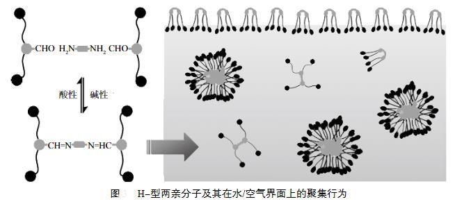 另外一類是含有活性可斷裂鍵的表面活性劑,其中亞胺鍵是一類比較典型的動態(tài)共價鍵。許多新穎的基于亞胺鍵構筑的H-型兩親分子,其中亞胺鍵用于連接兩個Bola型的兩親分子,H-型兩親分子自組裝可形成膠束,當pH從堿性調至弱酸性時,亞胺鍵發(fā)生水解,從而導致兩親分子的解離以及不同聚集體形態(tài)之間的轉變。