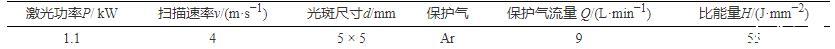 激光釬涂是利用激光作為熱源使釬料層熔化,進而潤濕并連接金剛石與基材的工藝,其原理如圖2所示。與傳統(tǒng)真空釬涂工藝相比,激光釬涂工藝可顯著降低涂層能量輸入,大大縮短熱循環(huán)周期,具有非常好的結(jié)構(gòu)和工藝適應(yīng)性。文中激光釬涂試驗系統(tǒng)包括功率為6 kW的LYS-6000-ST2型光纖激光設(shè)備和AcutEye型庫卡軌道機器人。分別對釬料涂層和釬料/金剛石涂層進行激光釬涂試驗。金剛石釬涂試驗時,首先將BNi-2釬料鋪在65Mn基板上,粉末厚度為0.5 mm,然后在BNi-2釬料層上沉積金剛石顆粒,隨后在金剛石表面再預(yù)置一層0.5mm的粉末釬料。首先,預(yù)置1 mm厚度的釬料合金粉末層,然后進行釬涂試驗,工藝參數(shù)如表1所示。試驗過程中,利用激光釬涂系統(tǒng)配備的高速攝像機觀察釬料層的熔化過程。使用Zeiss Smartzoom5型超景深顯微鏡對涂層形貌進行三維觀察和尺寸測量。通過Image-pro plus 6.0軟件對涂層超景深圖片色域進行調(diào)整,直至色域所覆蓋的區(qū)域為孔隙所占區(qū)域,測量方式選擇Per area(單位面積)。