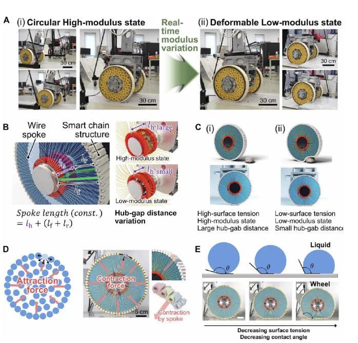 這是一個(gè)受液滴表面張力啟發(fā)的可變剛度輪。在液滴中,隨著最外層液體分子的內(nèi)聚力的增加,將液體分子向內(nèi)拉的凈力也增加。這導(dǎo)致高表面張力,導(dǎo)致液滴從引力引起的扭曲形狀恢復(fù)為圓形。同樣,車輪的形狀和剛度是通過改變最外層智能鏈塊的牽引力來控制的。隨著連接到每個(gè)鏈塊的鋼絲輻條張力的增加,車輪特性反映了一般圓剛輪的特性,這在正常平坦地面上的高速運(yùn)動(dòng)中具有優(yōu)勢。相反,隨著線輻條張力的減小,車輪的模量減小,并且根據(jù)障礙物的形狀,車輪容易變形。這使得輪子適合克服障礙物,而不需要復(fù)雜的控制或傳感系統(tǒng)。在此機(jī)理的基礎(chǔ)上,將輪子應(yīng)用于重達(dá)120 kg的兩輪輪椅系統(tǒng),實(shí)時(shí)實(shí)現(xiàn)了輪椅在室外環(huán)境中駕駛時(shí),圓形高模量狀態(tài)和可變形低模量狀態(tài)的狀態(tài)轉(zhuǎn)換。