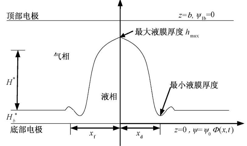 上述研究表明,電場強度對表面張力的影響大致分為表面張力隨電場強度提高而減小、增大和不變等三種情形。而目前對于受電場作用時的液滴運動的理論研究中,均假設表面張力不受電場影響,即表面張力不變,進而模擬其運動特征;這顯然與上述多數(shù)實驗所得結論明顯不符,也不能準確反映電場對液滴運動的影響。為此,本文基于實驗研究結果,建立表面張力與電場強度間的關系式,推導電場作用下描述液滴運動過程的演化方程,采用數(shù)值模擬獲得不同電場情形下的液滴運動行為,進而分析因電場作用帶來的表面張力變化對液滴運動特征的影響。