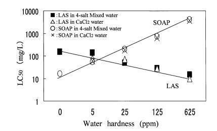 圖 3 水硬度對(duì)急性毒性的影響 LAS 和 SOAP 到 4-鹽混合中的羅漢果 水和 CaCl2 水
