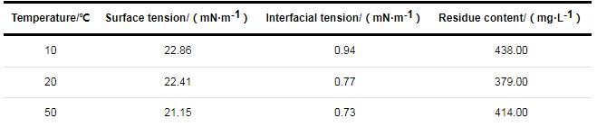 在水力壓裂過(guò)程中,僅壓裂返排液的粘度低不能說(shuō)明裂縫中的壓裂液已返排干凈,要綜合考慮其破膠性能。壓裂液在10、20和50℃條件下破膠3 h后,破膠液的表面張力、界面張力和殘?jiān)康臏y(cè)定結(jié)果如表3所示。由表中數(shù)據(jù)可知,無(wú)論是在10、20還是50℃條件下,破膠液的表面張力均小于28 mN/m,界面張力均小于2 mN/m,殘?jiān)烤∮?00 mg/L,達(dá)到或優(yōu)于我國(guó)石油天然氣行業(yè)標(biāo)準(zhǔn)SY/T 6376-2008《壓裂液通用技術(shù)條件》的要求,SY/T 6376-2008中關(guān)于破膠性能的各項(xiàng)指標(biāo)分別為:破膠時(shí)間≤720 min,破膠液表觀粘度≤5.0 mPa·s,破膠液表面張力≤28.0 mN/m,破膠液與煤油界面張力≤2.0 mN/m,殘?jiān)俊?00 mg/L。這充分說(shuō)明ME-O5在低溫下的破膠效果良好,在低溫油田壓裂破膠方面表現(xiàn)出巨大的應(yīng)用潛力。