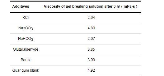 水基壓裂液是由多種不同的添加劑按比例配成的非均質(zhì)不穩(wěn)定化學(xué)體系。隨著壓裂技術(shù)的不斷發(fā)展,壓裂液體系也在不斷優(yōu)化。在實(shí)際的壓裂施工中,水基壓裂液的配方由于施工環(huán)境的不同,存在著較大的差異。本壓裂液配方選擇油田中常用的瓜爾膠作為稠化劑;選擇硼砂作為交聯(lián)劑;為了穩(wěn)定粘土礦物,選擇KCl作為粘土穩(wěn)定劑,以減少粘土礦物等對(duì)儲(chǔ)層滲透率造成的傷害;為了使壓裂液的性能更加穩(wěn)定,便于控制,還加入了一定量的Na2CO3和NaHCO3,作為pH調(diào)節(jié)劑。此外,從低成本的角度考慮,選擇戊二醛為殺菌劑,用來(lái)防止細(xì)菌滋生。