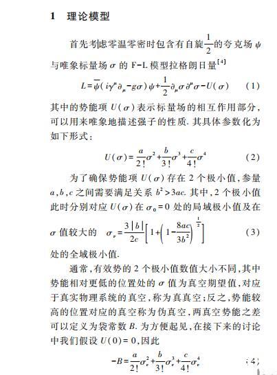本文具體采用的模型是具有夸克禁閉性質(zhì)的Friedberg-Lee模型(F-L Model)。F-L模型最初用于描述低能時(shí)強(qiáng)子的行為,將強(qiáng)子看做真空中的袋狀孤子解,為QCD理論中的禁閉行為提供了非常直觀的物理解釋。不僅如此,該模型也被擴(kuò)展至有限溫度密度下夸克物質(zhì)的退禁閉相變的研究,提供了研究夸克強(qiáng)子相變性質(zhì)的有利手段。但是該模型只能給出有限溫度密度下夸克物質(zhì)一級相變的結(jié)果,無法討論平滑過渡(Crossover)相變和相臨界截點(diǎn)相關(guān)的物理問題,具有一定局限性。不過本文主要研究夸克強(qiáng)子一級相變下氣泡或液滴的動力學(xué)問題,F(xiàn)-L模型是比較合適的模型。