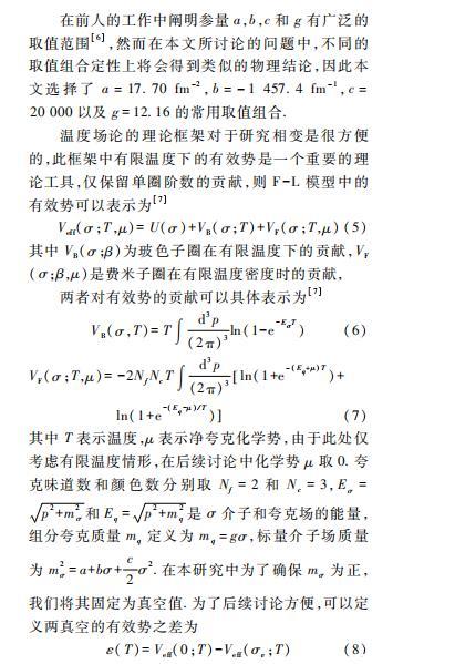 由于氣泡或液滴只有在一級相變過程中才會出現(xiàn),而F-L模型將復(fù)雜的膠子場簡化為易處理的標(biāo)量場進(jìn)行唯象地描述,能夠抓住夸克物質(zhì)一級相變中氣泡或液滴動力學(xué)中的關(guān)鍵物理性質(zhì),同時(shí)帶來非線性動力學(xué)場方程求解上的極大簡化,因此本文采用F-L模型。雖然在研究QCD的有效模型中還有各種手征模型,但是考慮到其具有同位旋內(nèi)稟自由度,對應(yīng)氣泡或液滴的動力學(xué)場方程將變得更為復(fù)雜,我們將在未來的工作中進(jìn)一步考慮這些問題。