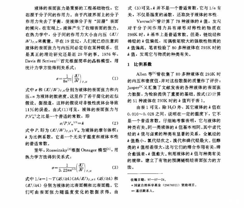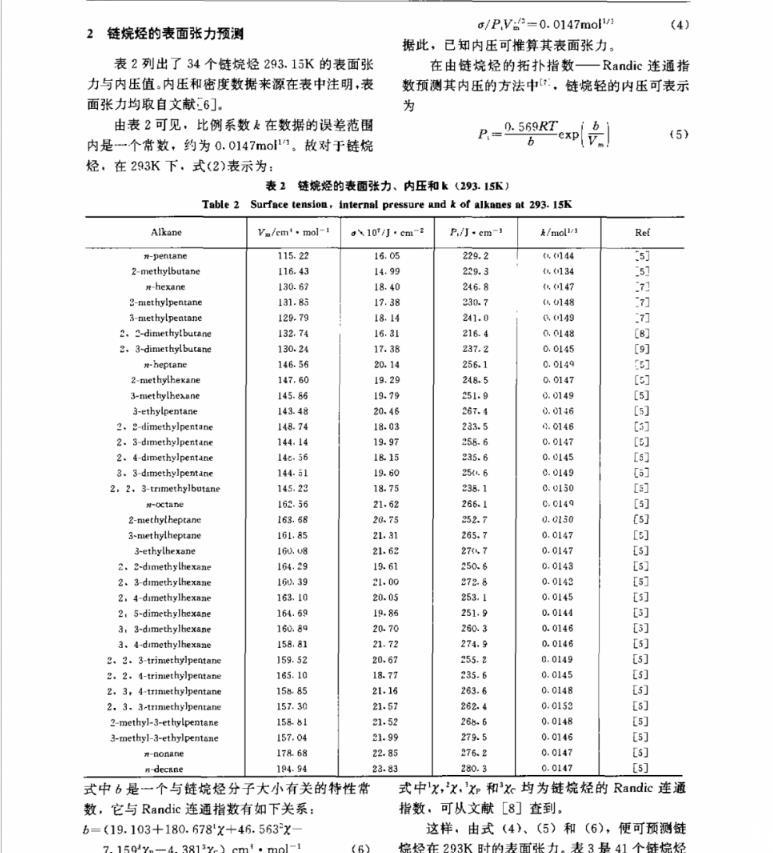 對Davis和Rosseinsky提出的關(guān)系檢驗表明,液體的表面張力σ與P1Vm1/3之比不僅取決于溫度,還與液體的種類有關(guān),據(jù)此,建立了一個能由鏈烷烴的分子結(jié)構(gòu)準確預(yù)測其表面張力的方法。