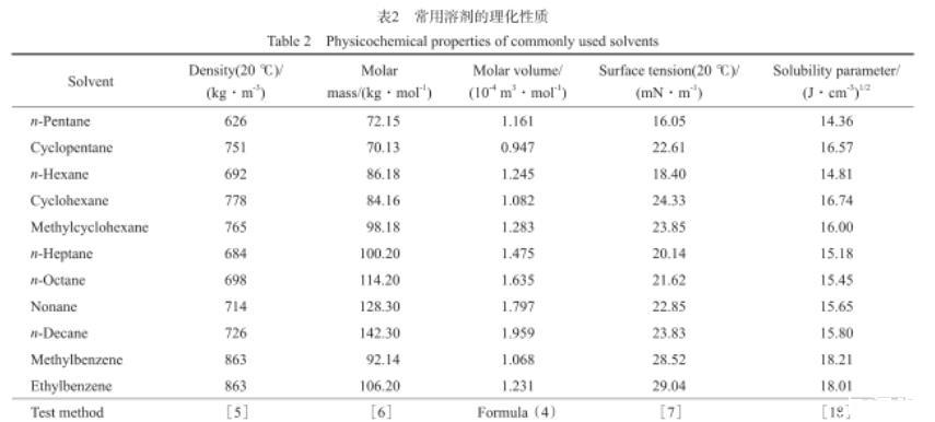 通過表面張力估算法測定低芳淺色礦物油的溶解度參數(shù)。以溶解度參數(shù)定義為基礎,結合溶解度參數(shù)實驗經(jīng)驗公式和表面張力與液滴大小的關系,推導出表面張力與溶解度參數(shù)的擬合關系式。通過與11種含弱極性鍵的有機溶劑溶解度參數(shù)的文獻值進行對比計算,得到溶解度參數(shù)的表面張力表達式的各個系數(shù)。利用溶解度參數(shù)表面張力表達式,計算29種常見的低芳淺色礦物油的溶解度參數(shù)。計算結果表明,29種低芳淺色礦物油的溶解度參數(shù)計算值為14.40~16.07(J/cm3)1/2,經(jīng)與文獻值對比證明了擬合公式的準確性。