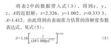 將表2中的數(shù)據(jù)帶入式(3),得到x,y,z,A的近似解:x≈2.326,y≈1.002,z≈0.333 3,A≈1.412。由此得到由表面張力估算的溶解度參數(shù)表達式,見式(5):