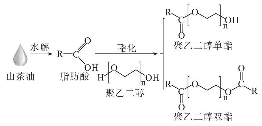 為了解決上述問題,本文以聚乙二醇600(PEG600)和山茶油水解產(chǎn)物為原料,通過水解-酯化兩步法制備改性山茶油,并對其各項性能指標進行評價,為山茶油在水劑型化妝品中的應用提供數(shù)據(jù)支持。改性山茶油的制備原理如圖1所示。