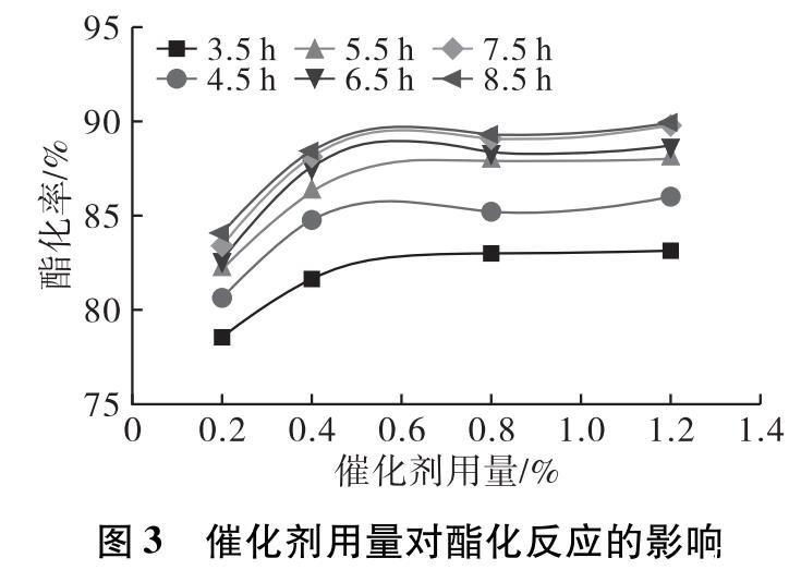 在投料比1∶1,預(yù)熱溫度80℃,預(yù)熱時間5 min,催化劑選擇4?型分子篩,反應(yīng)溫度140℃,反應(yīng)時間8.5 h,催化劑用量分別為0.2%、0.4%、0.8%、1.2%條件下進(jìn)行酯化反應(yīng)。反應(yīng)3.5 h后每隔1 h取樣測試產(chǎn)物酸價,計算酯化率隨時間的變化,結(jié)果如圖3所示。