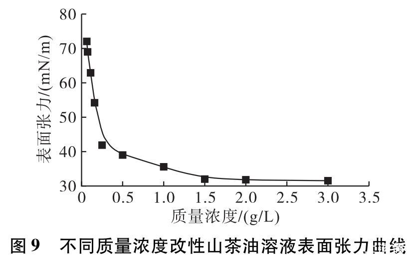 對不同質(zhì)量濃度的改性山茶油溶液進(jìn)行表面張力測試,結(jié)果如圖9所示。