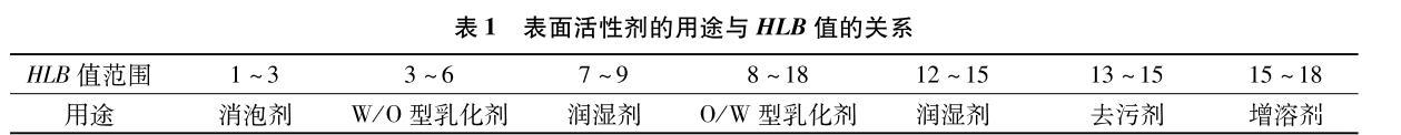 HLB值可用來衡量表面活性劑的親水親油性的大小,HLB值越大代表親水性越強(qiáng),HLB值越小代表親油性越強(qiáng),HLB值的轉(zhuǎn)折點為10,HLB值大于10一般為親水性,HLB值小于10為親油性,人們一般以HLB值為標(biāo)準(zhǔn)指導(dǎo)表面活性劑的實際應(yīng)用(見表1)。