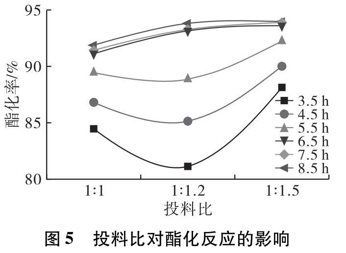 在投料比分別取1∶1、1∶1.2、1∶1.5,預(yù)熱溫度80℃,預(yù)熱時間5 min,0.4%的4?型分子篩催化劑,反應(yīng)溫度180℃,反應(yīng)時間8.5 h條件下進(jìn)行酯化反應(yīng)。反應(yīng)3.5 h后每隔1 h取樣測試產(chǎn)物酸價,計算酯化率隨時間的變化,結(jié)果如圖5所示。