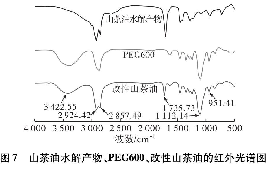 用50 mL的乙酸乙酯飽和食鹽水溶液分3次萃取產(chǎn)物,除去未完全反應(yīng)的PEG600和山茶油水解產(chǎn)物,氮吹,干燥。對山茶油水解產(chǎn)物、PEG600和改性山茶油分別進(jìn)行紅外性能表征,其紅外光譜圖如圖7所示。