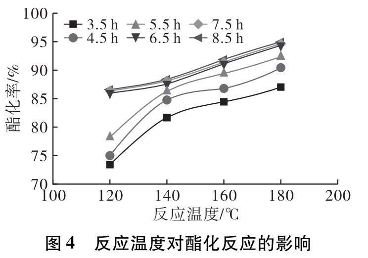 在投料比1∶1,預(yù)熱溫度80℃,預(yù)熱時間5 min,0.4%的4?型分子篩催化劑,分別設(shè)定反應(yīng)溫度為120、140、160、180℃,反應(yīng)時間8.5 h條件下進(jìn)行酯化反應(yīng)。反應(yīng)3.5 h后每隔1 h取樣測試產(chǎn)物酸價,計算酯化率隨時間的變化,結(jié)果如圖4所示。