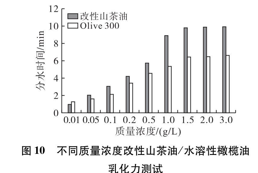 采用分水法對不同質(zhì)量濃度的改性山茶油和水溶性橄欖油(Olive 300)進(jìn)行乳化力測試,分水時間越長表明乳化性能越好,其結(jié)果如圖10所示。