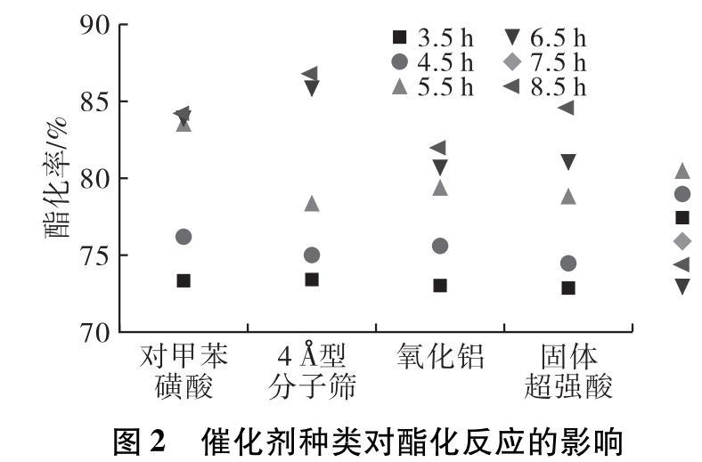 由圖2可知,在相同的工藝條件下4?型分子篩的催化效率高于其他催化劑。原因主要有兩點:首先,4?型分子篩復(fù)雜的孔道結(jié)構(gòu)性相比其他催化劑增加了催化反應(yīng)面積,并且具有較高的活性和穩(wěn)定性;其次,由于試驗過程沒有進(jìn)行分水處理,導(dǎo)致反應(yīng)產(chǎn)生的水滯留在體系中,體系達(dá)到平衡,而4?型分子篩具有一定的吸水作用,可以使平衡向正反應(yīng)方向移動,提高了酯化率。而且在試驗后處理方面,4?型分子篩只需過濾處理,回收后還具有一定的催化活性,可以重復(fù)使用。綜合考慮,最終選擇4?型分子篩作為反應(yīng)的催化劑。
