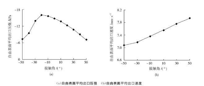 表面張力系數(shù)取50N/mm,接觸角取值為-50°~50°時得到的自由表面出口壓強(qiáng)與自由表面出口平均速度曲線如圖10所示。