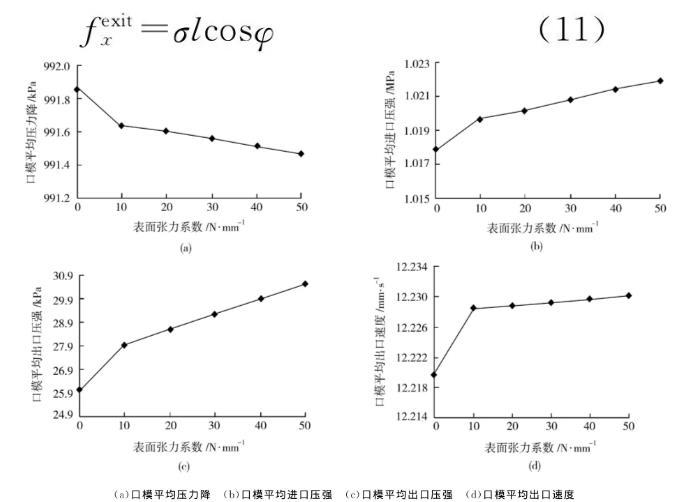 (2)在微擠出中,表面張力系數(shù)越大,擠出脹大越明顯,擠出口模內(nèi)熔體的進(jìn)出口壓強(qiáng)都明顯增大,口模內(nèi)熔體的壓力降略微減小,平均出口速度略微增大,自由表面出口壓力與平均出口速度都明顯減??;