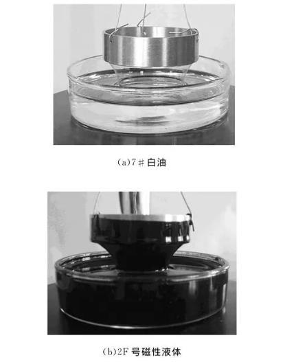力敏傳感器定標(biāo)數(shù)據(jù)見表1,使用Origin軟件對直線進(jìn)行擬合,可得力敏傳感器靈敏度B=7.727V/N.測量無外加磁場作用的磁性液體表面張力系數(shù)時,為直觀觀察拉脫時液膜的變化過程,將培養(yǎng)皿放置于電磁線圈端部進(jìn)行測量,圖3為拉脫過程中某一瞬間液膜的收縮狀態(tài),從圖中可看到,磁性液體的液膜拉得更長,液膜收縮的趨勢比白油更明顯,這主要是因為磁性液體中加入的表面活性劑降低了其表面張力。可從表面張力形成原理來分析其中的原因:第一,液體表面張力系數(shù)的大小宏觀上反映出液體表面具有自動收縮的趨勢,表面張力系數(shù)較大的白油由于分子和分子之間的引力較大,表面層分子更容易向液體內(nèi)部運(yùn)動,某一拉力作用下,液膜斷裂,不易拉起較長的液膜;第二,不同液體對同一種固體的浸潤程度不一樣,表面張力系數(shù)小的液體(0.03N/m左右),幾乎能浸潤一切固體;表面張力系數(shù)較大的液體,只能浸潤某些固體;7#白油的表面張力系數(shù)大于磁性液體,片狀吊環(huán)和磁性液體的結(jié)合力大于片狀吊環(huán)和7#白油的結(jié)合力;液膜不容易和片狀吊環(huán)脫離,拉起來的液膜比較長。